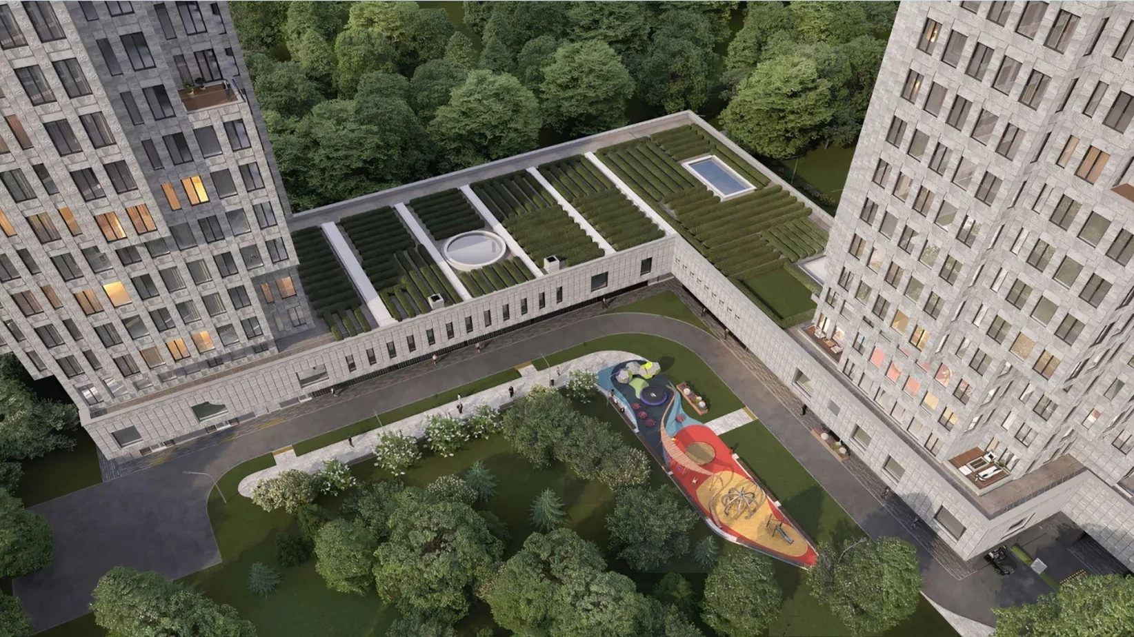 Внутренний двор закрыт для посторонних. Цветы и растения высажены даже на крыше стилобата: лишь бы ваш взгляд не скучал при виде обычной кровли. В городской гостиной — амфитеатре с видом на галерею — легко зарядиться энергией Москвы, не покидая дома надолго.