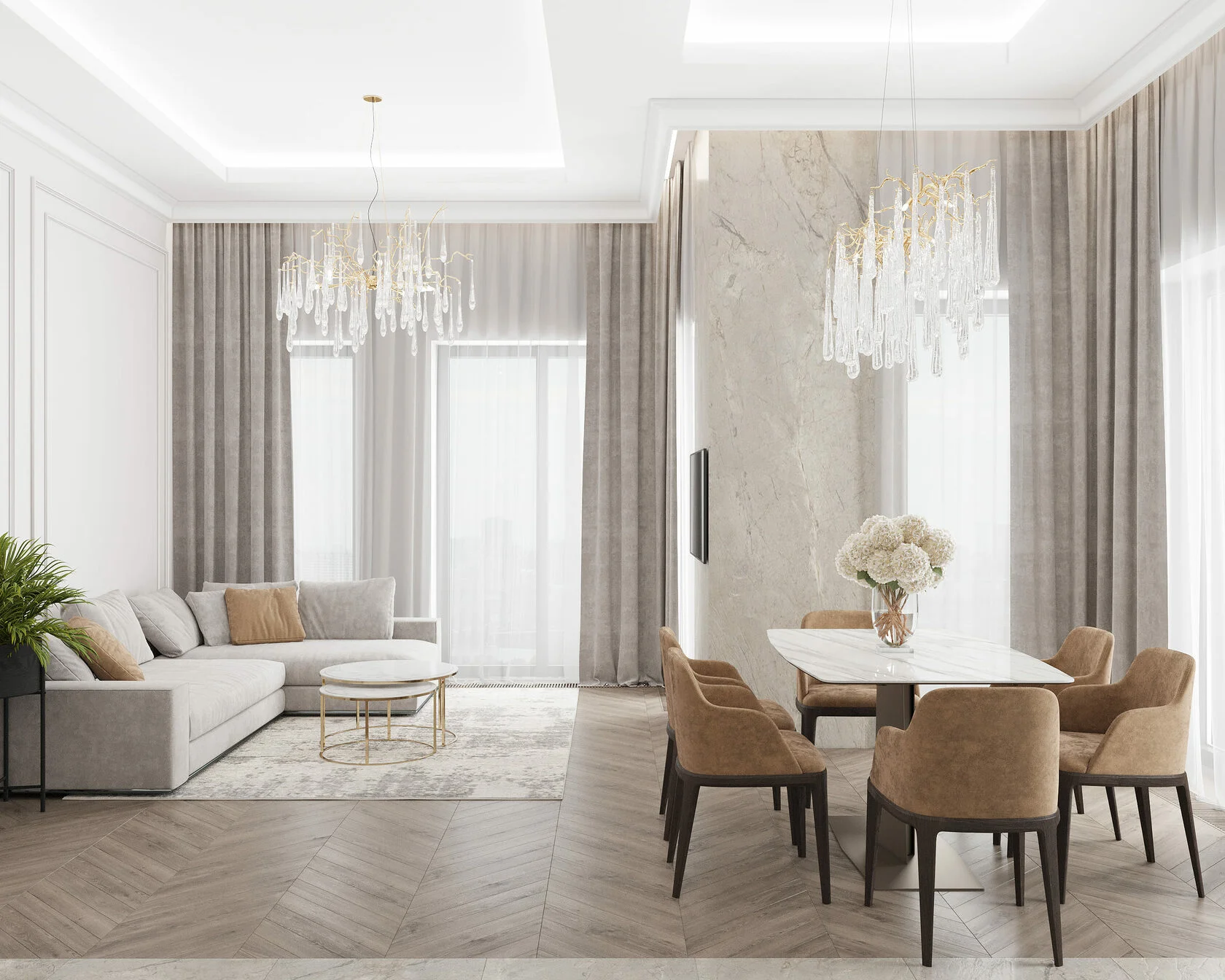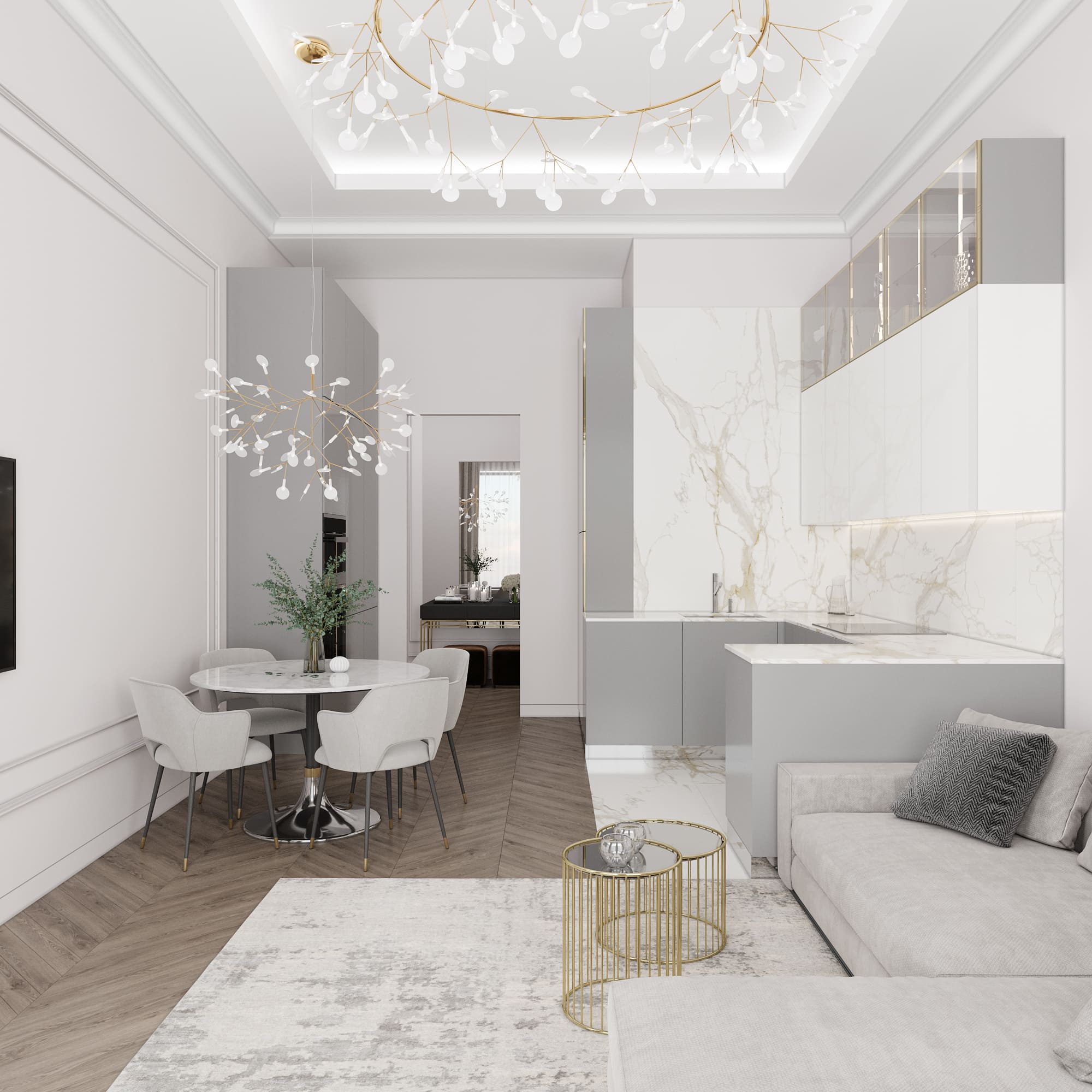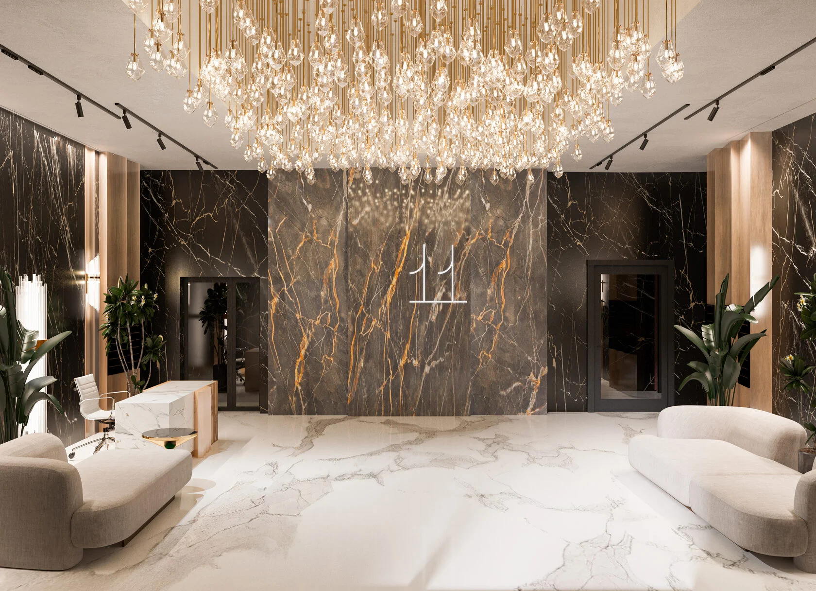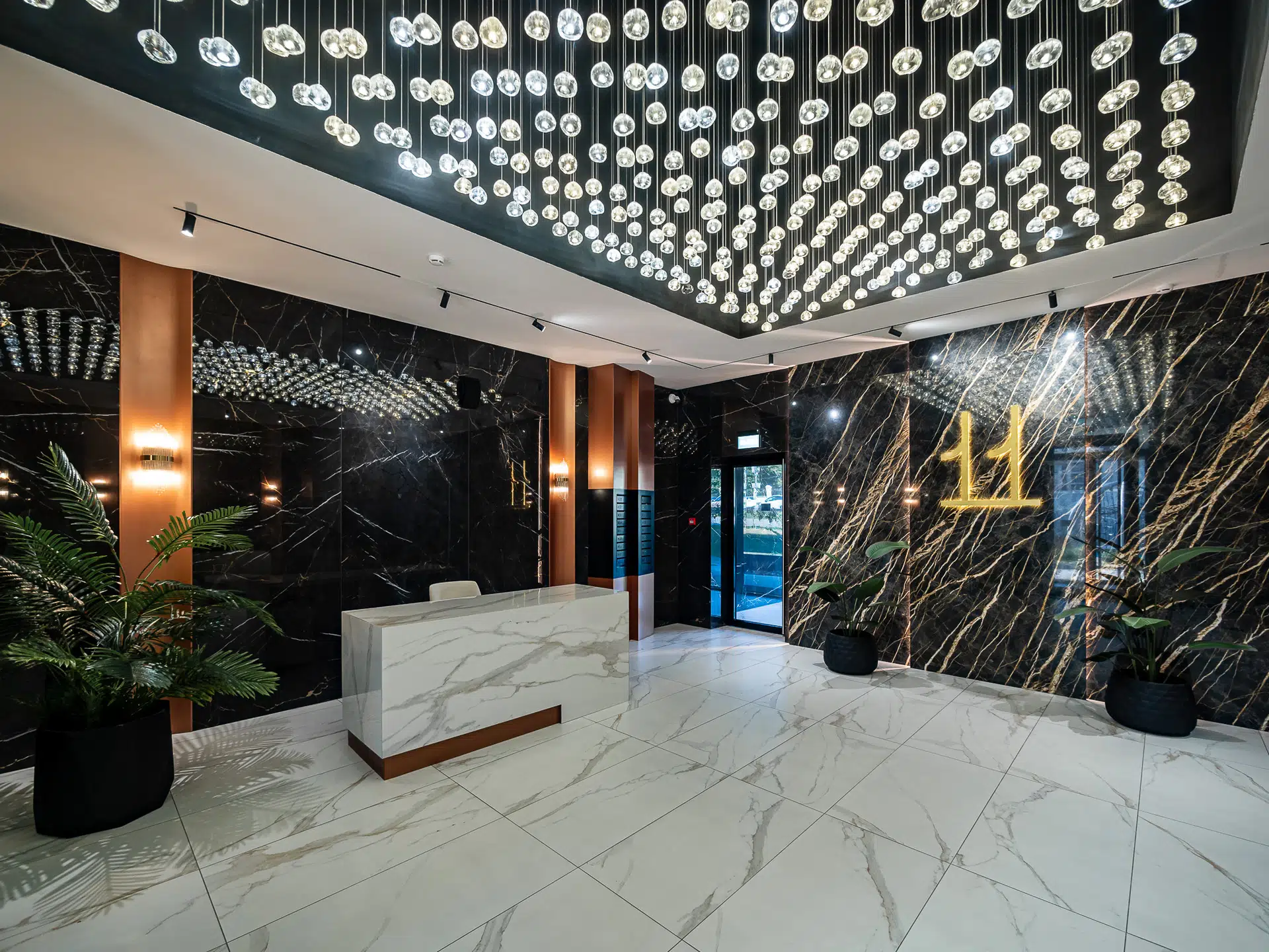 Роскошное просторное лобби с потолками до 7-ми метров. Сочетание натурального черного мрамора и премиального керамогранита подчеркивает высокий статус. Дизайнерская люстра наполняет пространство мягким золотистым светом.