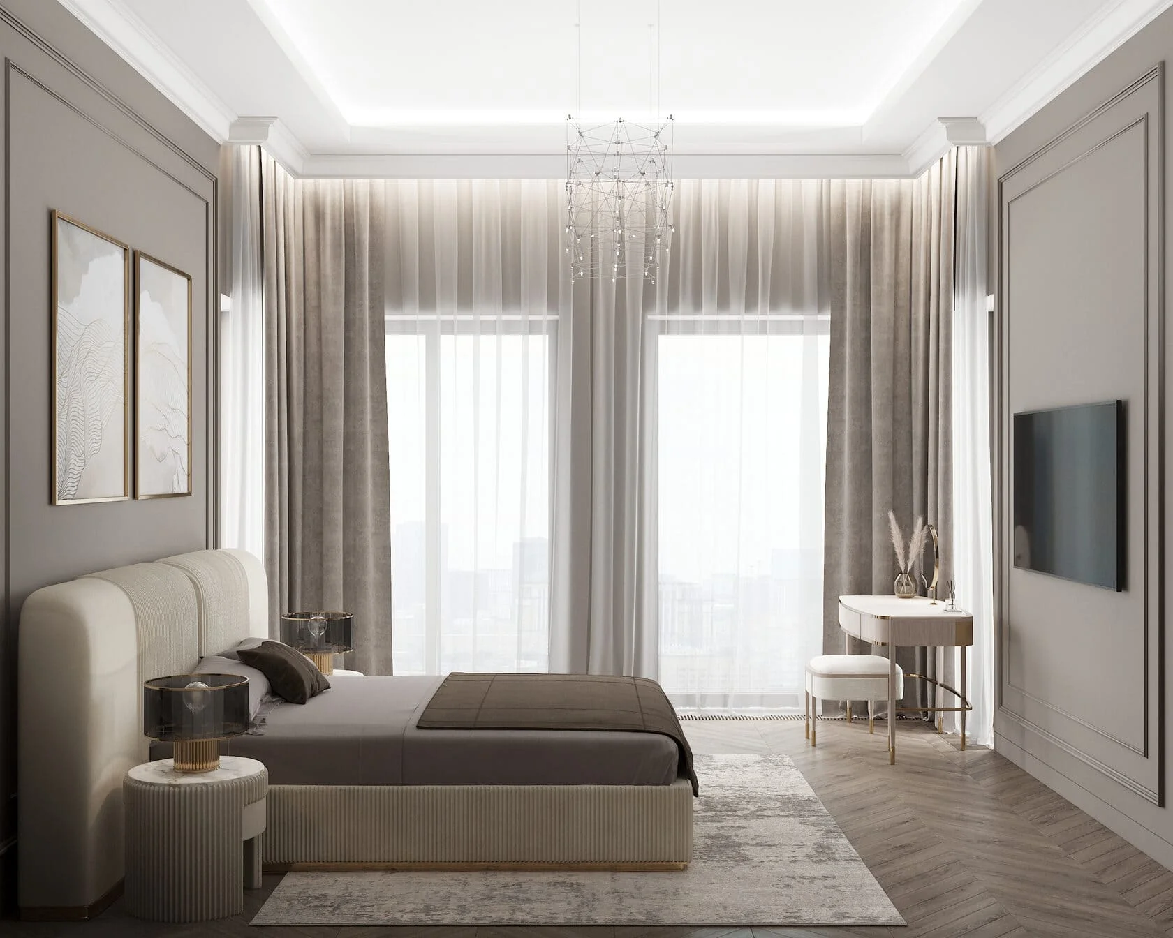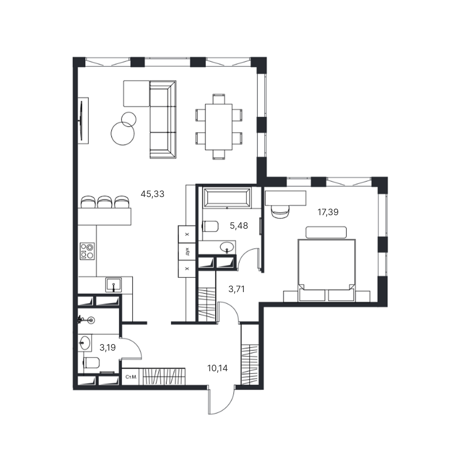 Все квартиры в жилом комплексе продаются с отделкой «под ключ», выполненной в одном из двух стилей: светлом и контрастном. Высота потолков составляет 3,6–3,8 м, в пентхаусах — 4,2 м и 4,5 м. Панорамные окна «в пол» имеют высоту 2,8 м.